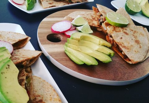 김치 갈비 퀘사디야와 치킨 퀘사디야. 전날 저녁에 굽고 남은 갈비 잘게 잘라 김치, 치즈 넣고 약불에 구워내었어요. 치킨도 남은 치킨과 피망, 고추 치즈 등등 넣어 볶아 구워내어 빠른 브런치 완성.