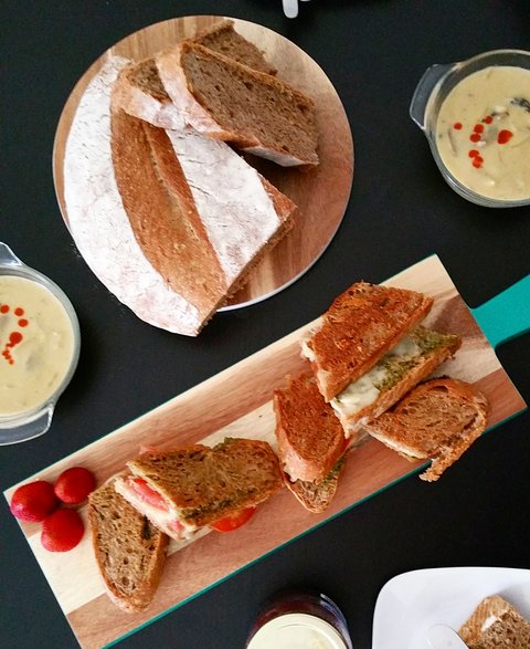 베이킹을 워낙 좋아해 이것저것 구워보려 틈틈히 노력중이에요. 이건 집에서 구운 통밀빵과 버섯크림스프, 그리고 빵에 바질 페스토, 치즈, 토마토를 넣어 구운 샌드위치에요