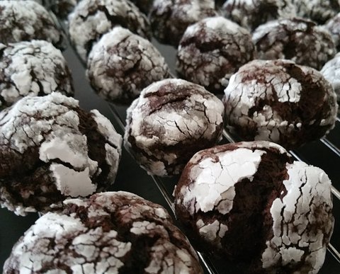 초콜렛 크링클 쿠키. 코코아파우더 넣고 반죽해 위에는 슈거파우더를 뭍혀 구웠어요
