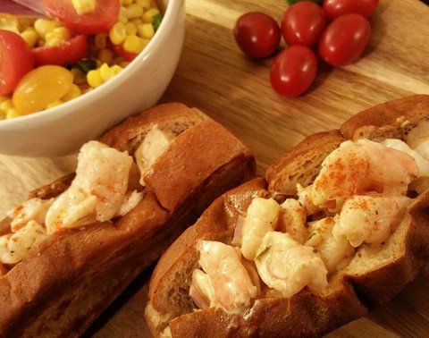 새우롤과 콘샐러드에요! 새우를 오븐에 구워 마요네즈와 라임, 소금, 후추 향신료를 넣어 샐러드를 만들어 빵 사이에 끼워주었어요