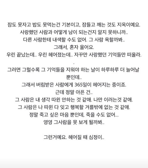 이제 한달 지남 한번도 안잡아준 그사람이 너무나 미웠음 하지만 나는 나를 사랑하지 않는 사람을 놓친거지만 그사람은 자기자신을 사랑해..
