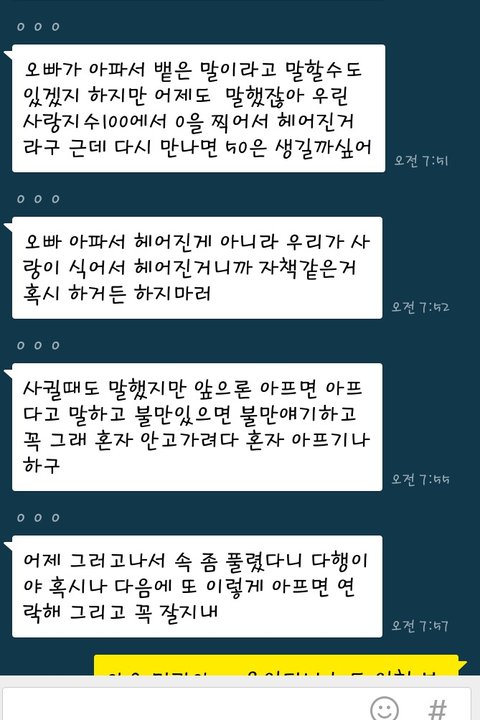다음날이 되고 저는 그녀에게 연락해 다시 만나자고 했습니다. 그녀가 알겠다고 할줄알았지만 대답은 아직은 힘들것 같다였어요. 힘들었데요 한달동안 자기는 무덤덤해지고 정리를 했다네요. 오빠가 아파서 해어진게 아니라 사랑이 식어져서 헤어진거다 나에게 미안해 하지말라고 자기는 잘지내고 있다고 ...저는 할말을 잃고 아무 대답을 못하고있었습니다.