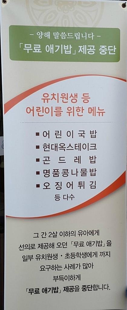 헐...무슨 애기밥을 유치원생에다 초등학생까지...;;보통 36개월 이하 아이들까지만 무료던데 어린이 메뉴 그거 얼마라고 거지들이 참 많네요..