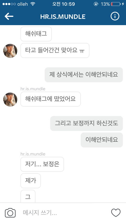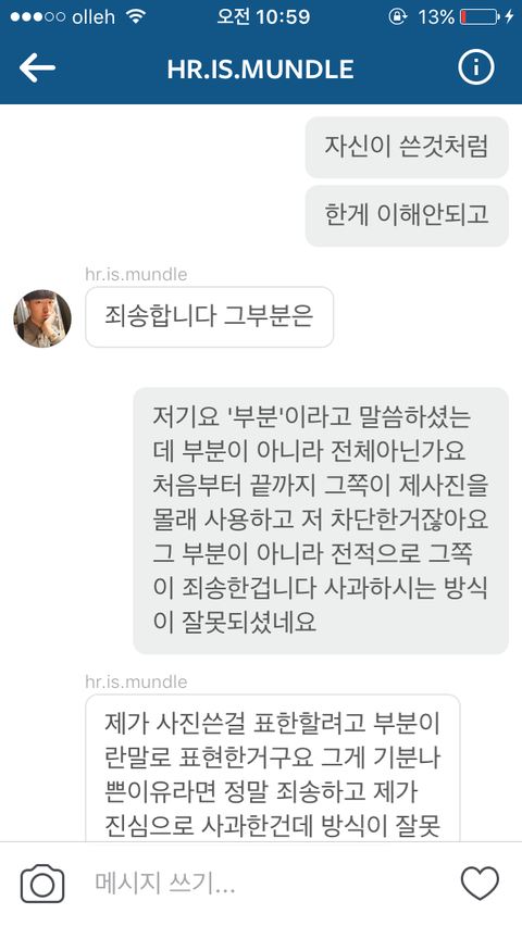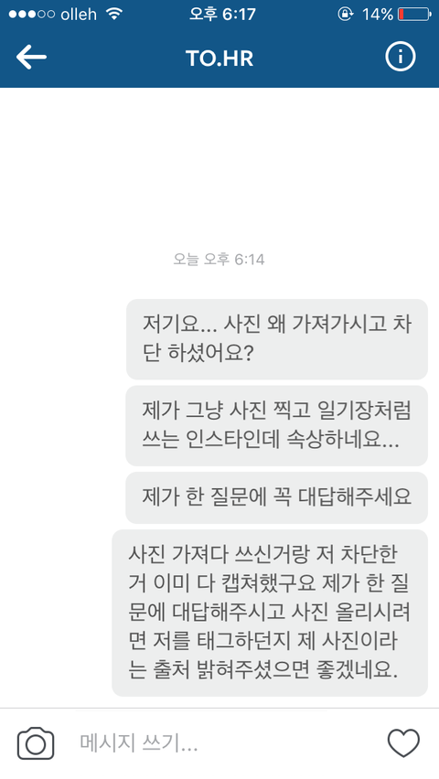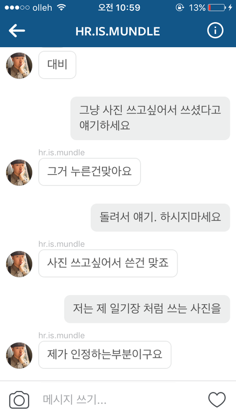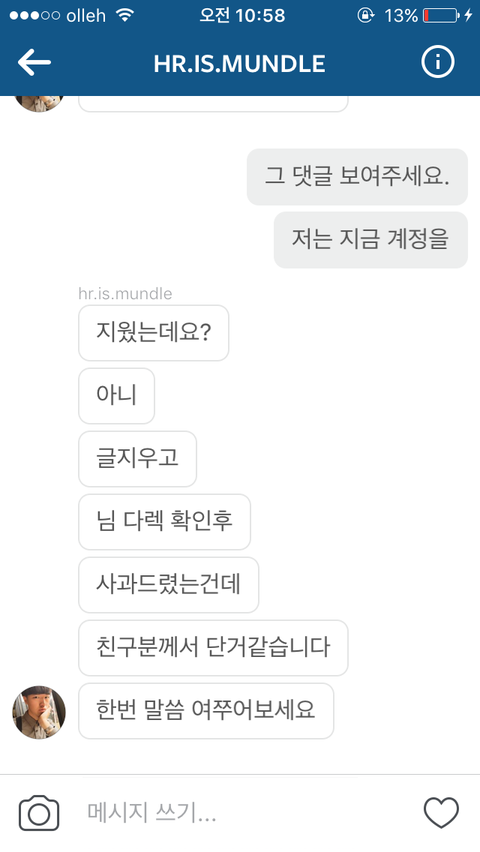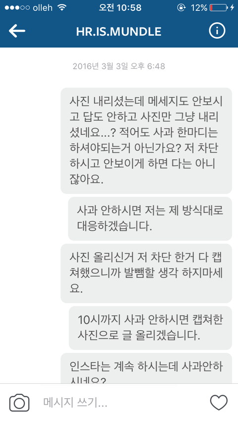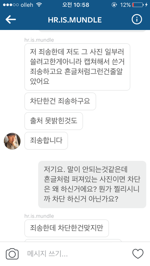 사진올리는 계정으로 다이렉트 메세지 보낸 캡쳐본입니다.
