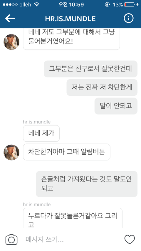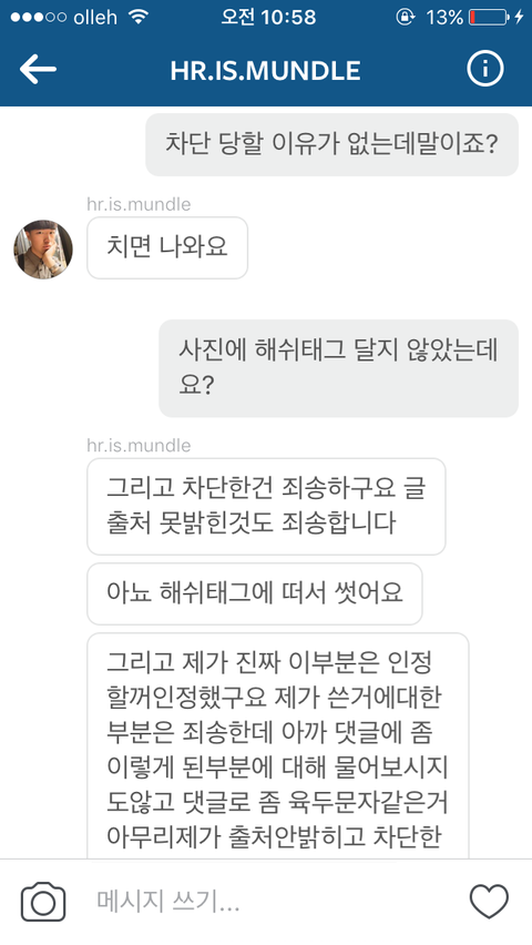 그래서 제가 그럼 저는 왜 차단 했냐 찔려서 한게 아니냐 했더니