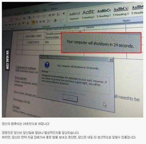 미국에서 초과근무시에 컴퓨터에 뜨는창