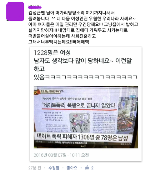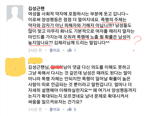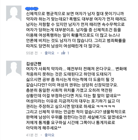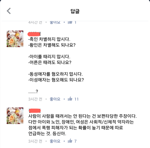 어떤 사람이 페북에 '여자를 때리지 말라'는 댓글을 달았는데 남자들 반응이 하나같이