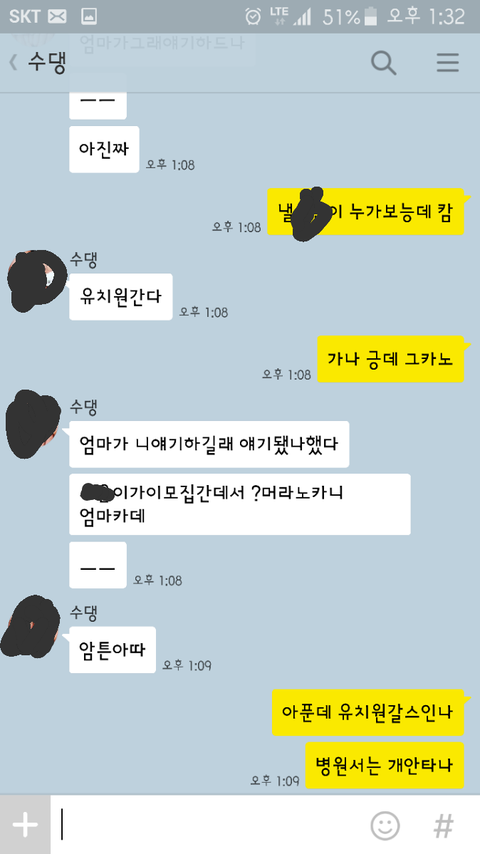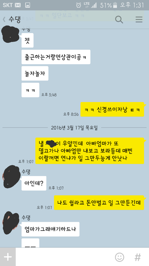 중간에 엄마한테 전화해서 언니는 유치원보낸다고 그랬다는데 왜 나한테 거짓말까지 하며 맡을려고하냐 걱정되더라도 제발 그러지말라하고 언니와 계속 대화했습니다