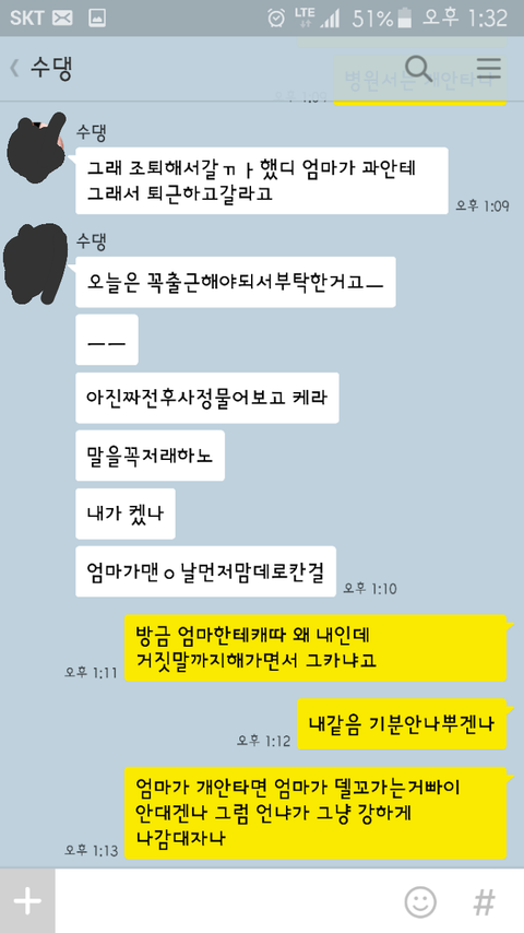 참고로 그전에 엄마랑 언니가 이미 얘기가 된 상태에서 저한테 엄마가 연락을 한겁니다. 엄마전화 끊고 바로 언니한테 톡했는데 언니가 알고있었으니까요