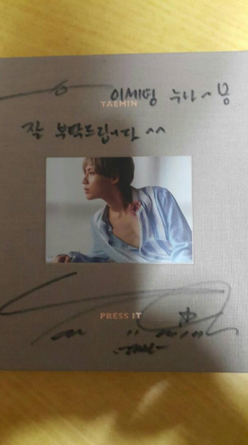 사진 속에는 태민의 솔로 앨범 싸인 CD의 모습이 담겨있다. “이세영 누나~! 잘 부탁드립니다^^”라는 글귀가 적혀있어 부러움을 자아내고 있다.