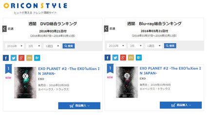 엑소는 일본에서 지난 9일 DVD와 Blu-ray Disc(이하 BD)로 발매된 ‘EXO PLANET #2 ? The EXO’luXion IN JAPAN?’(엑소플래닛 #2-디 엑솔루션 인 재팬)으로 오리콘 DVD 종합 차트 및 BD 종합 차트 1위를 차지함은 물론, DVD와 BD 판매량을 합산한 종합 뮤직 영상 차트에서도 1위에 등극, 오리콘 위클리 3관왕에 오르는 기염을 토했다.