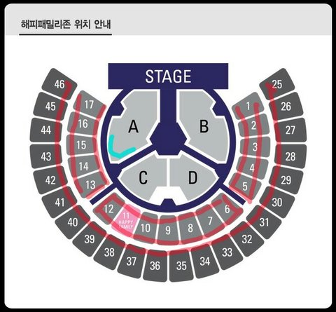 하늘색은 첫콘에서의 내 경험상 추천하는 자리. 여기저기 왔다갔다해봤는데 하늘색이 제일 잘보임 본무대도 잘 보임 애들 동선이랑 이런거. 종인이 얼굴은 본무대쪽에 있을 때만 봤는데 나머지 멤버들은 저 하늘색에서도 다 봄. 게다가 물돈크 근처라 ㄹㅇ 좋 그리고 첫콘땐 하늘색쪽으로 싸인볼 던짐