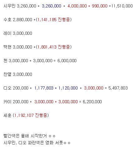시우민 3,260,000 + 3,260,000 + 4,000,000 + 990,000 =11,510,000
