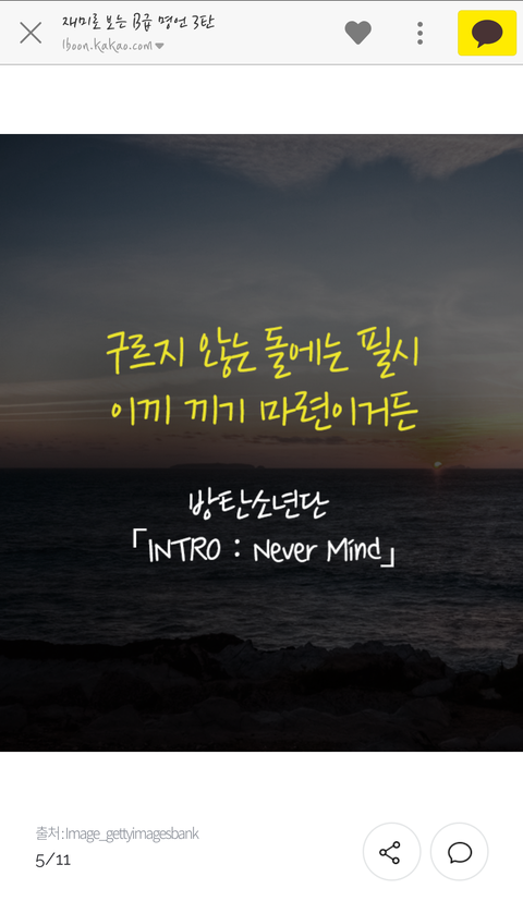 나한텐 그 어떤 허울좋은 명언들보다 큰 위안이 되었던 A++급 명언이야 (물론 글쓴이가 그런의도가아니었다는거알아! '재미로보는'이라고말머리도붙여줬고다만 가사가명언으로꼽힐만큼방탄이가사를잘쓴다는거 그게 좋은거지ㅎ)