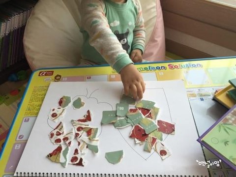 찢어논 종이를 하나씩 붙여줬어요.