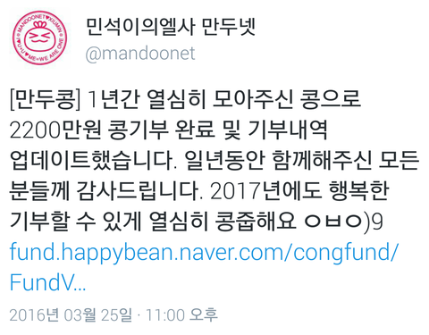 만두넷 2200만원 해피빈 기부완료(시우민 생일