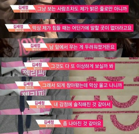 순위 발표식 표정 보는데 조카 안절부절해보이고 2위하니까 오히려편해보이더라 니들이 하도 가식 ㅇㅈㄹ하니까 인터뷰에서도 그런 류 언급하고; 김세정 뿐만 아니라 저 짧은 순간을 인성 어쩌고 하는데 연습생들 너무 안됐더라 다 힘내고 세정이 말처럼 꿈의 끝에서 모두 만나길