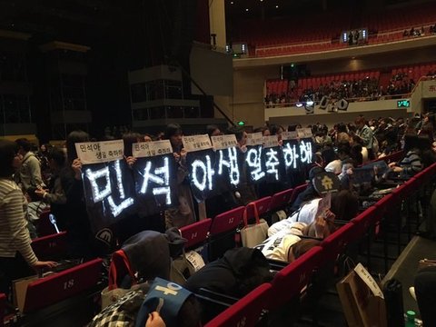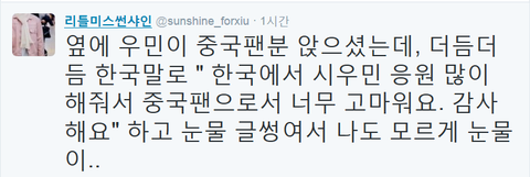 트윗 구경하다가 가슴 찡한 글을 봤어 한 중국팬분이 한국에서 민석이 많이 응원해줘서 너무 고맙다고 눈물 글썽이셨다는... 그것도 서툰 한국말로 한마디 한마디 하셨다니까 진심이 느껴져서 짧은 글인데도 울컥했네 오늘 공연장 앞에서 대형 스크린으로 생축 광고도 해주시고, 케잌나누면서 아기자기한 행사도 많이 했나본데 진짜 다 너무 감사함. 민석이 생일 노래까지 잘 마무리 되길!! 중국팬분들 민석이 응원하는 마음으로 위아원이에요! 감사합니다!!!!
