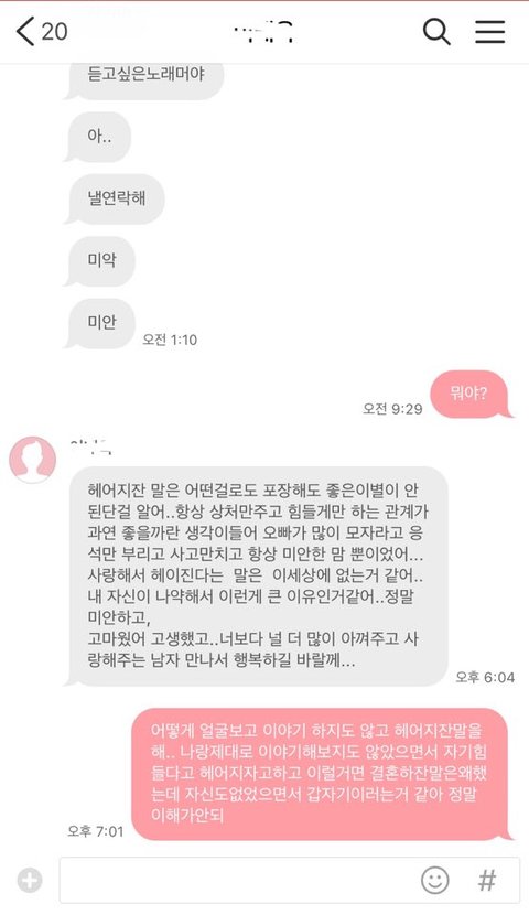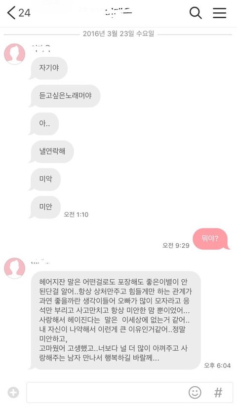 이로부터 하루 후 장문의 이별의 카톡이 왔습니다.
