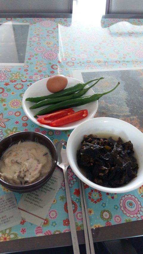 아참 오늘 점심은 소고기 미역국 건더기 무염 버섯콩비지 야채 그리고 삶은 계란.