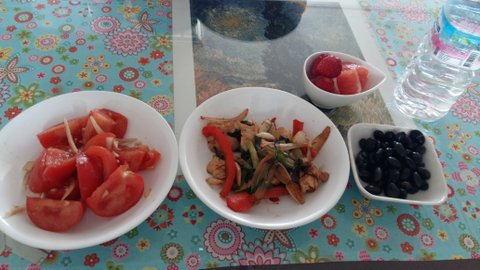 점심은 크래미 세개, 닭가슴살반개와 양파 마늘 구운것, 발사믹 식초와 레드 오니언에 절인 토마토,, 딸기 다섯알정도였구