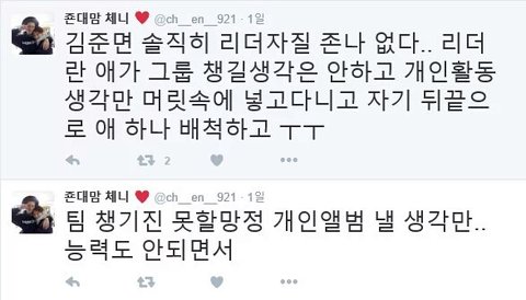 수호악개들 조카뻔뻔하네 찬열이가 전세계인기꼴지 수호한테 앨범얘기했다고 아직도 찬열이패는것들이 수호는 인터뷰는 멤버한명왕따시키고도 인기없어서 안까이는줄알아라