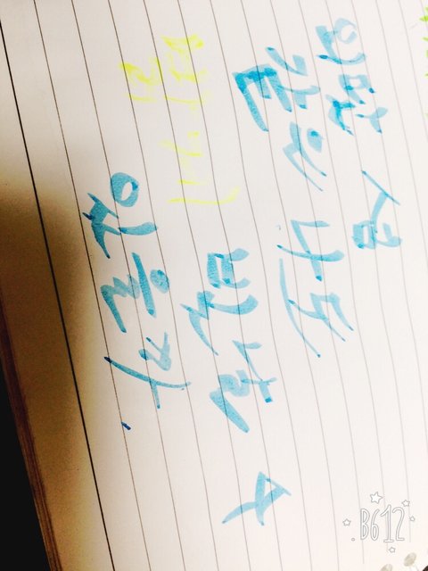 웨일리언52로 캘리그라피 해봤어 처음 하는거라 못 하긴 했는데 색깔 저런거는 형광펜으로 해서 그래 참고로 배운거 아니야