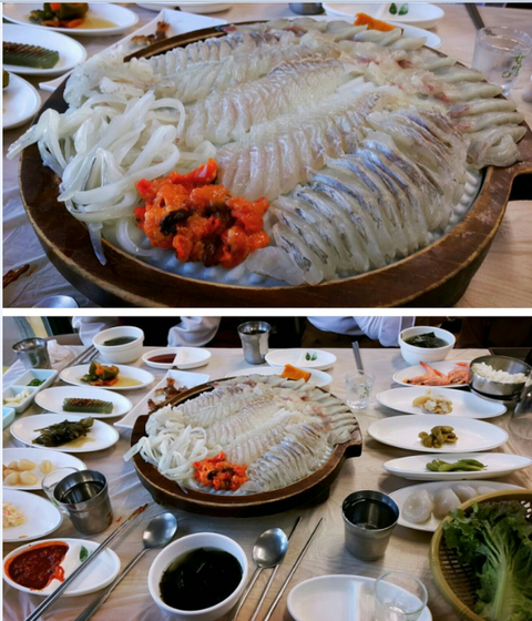 멍게+소라+전복+오징어+모듬회+매운탕+물회 (가진항 회센터)