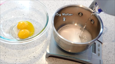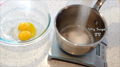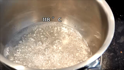 4. 설탕 50g이랑 물 15g을 냄비에넣고 중약불에 118도가 될때까지 끓여서 설탕시럽을 만들어줘요.