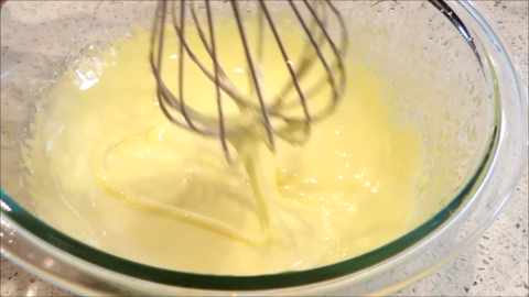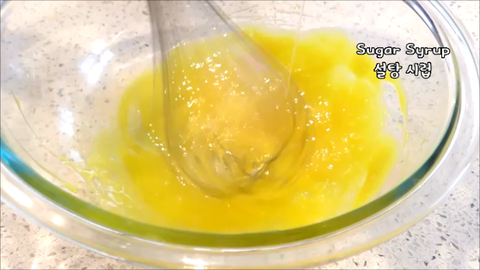 5. 풀어둔 노른자에다가 천천히 설탕시럽을 부으면서 아이보리색이 날때까지 휘핑해줘요.