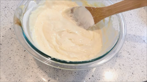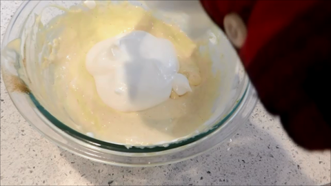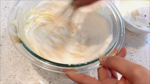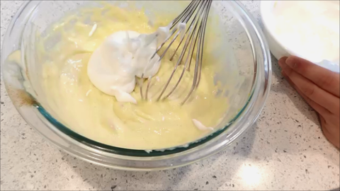 9. 휘핑한 생크림의 1/2을 노른자반죽에넣고 섞어줘요.