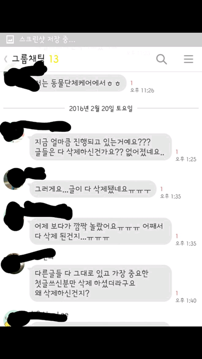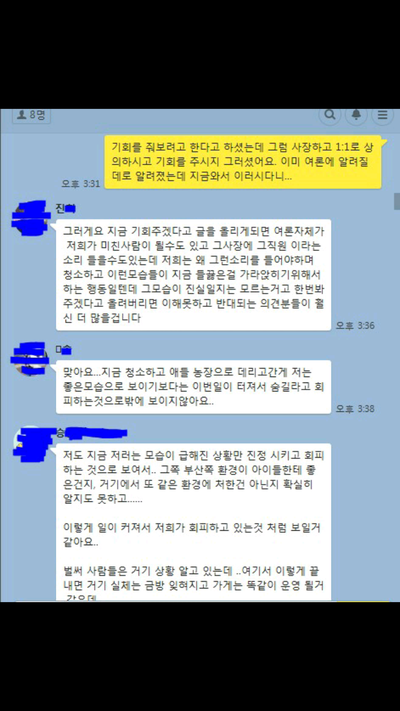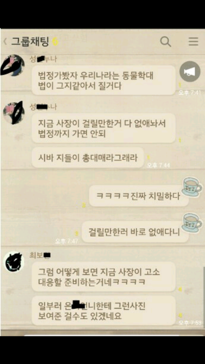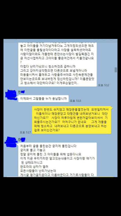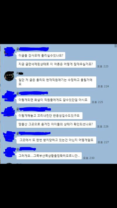 저희가 잠잠해질때까지 기다린다네요 올리지않은 내용중엔 운영을 하고있고 손님들 많이 온답니다 모르는사람들이 더 많다고 대한민국국민이 많다며애견쪽에서만 살짝 퍼진거라고 대화하는 내용들도 있어요 진짜 대한민국 애견인구국민이 많다는걸 보여주세요
