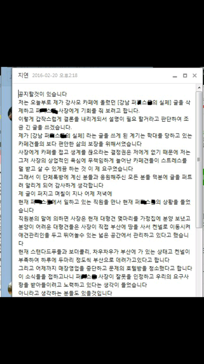 첫 글 올리고 난 후 퍼x스푼에 대한 여러가지 글들이 올라오며 힘을 실어줬고글 올린 친구들 끼리 단체톡방을 만들었어요 있었던일 들 내용과 어떻게 신고할까 방속쪽 얘기도 계속 오갔구요 근데 다음날 하루아침에 원글 쓴 분이 글을 삭제하고 공지로 사장에게 기회를 준다는 말도 안되는 소리를 하더군요 저희는 화가 났고 알고보니 그 이유가 현직원과 친한사이인 원글쓴 분과 일했던 몇직원들은 이미 다시 사장편이 되었더군요 차라리 고소가 무서워서 지운거면 이해라도 하지요 ..무슨일이 있던건지 소름끼칩니다 이사람들 진짜 미친사람들이예요 ...강아지위하는척 글쓸땐 언제고..저희는 오래 일한 직원들은 아닙니다 저희는 힘이없어요 제발 관심가져주세요 아이들 학대 방치 전부 사실입니다 ...죽은 아이들은 수도없이 많은데 현직원과 사장은 지금 증거인멸중입니다 ..그러니 제발 읽어주세요