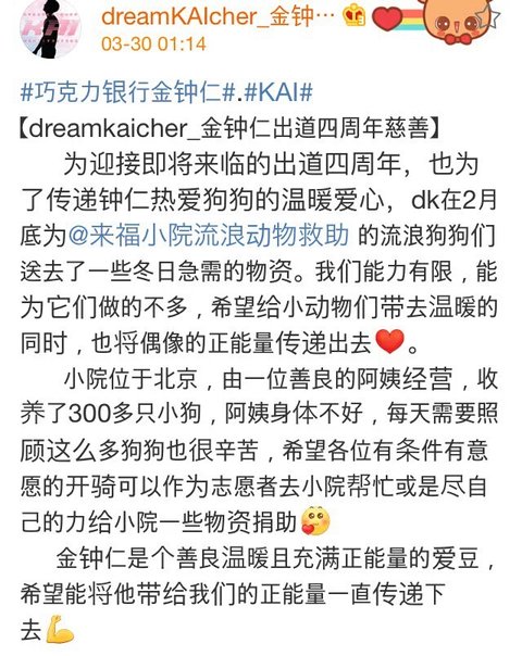 종인이 데뷔 4주년 기념 중국팬분들의 유기견 보호소 물품 지원