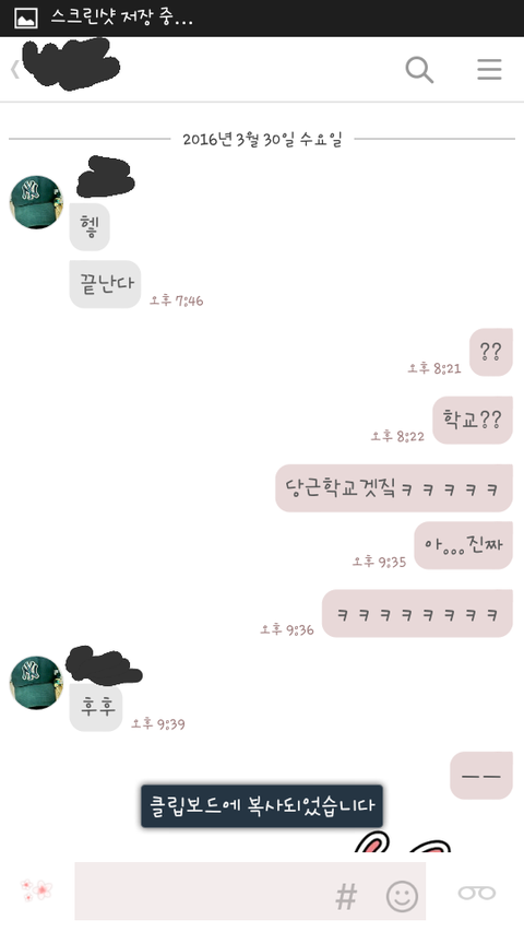 봐봨ㅋㅋㅋㅋㅋ쟤말투저런거이해좀ㅋㅋㅋㅋ나도저럴줄은몰랏...핳ㅋㅋㅋㅋ 근대톡을버내면진짜늦게봐...내가보낼까말까하다다시한반보냇다니그제서야답...ㅠㅠㅠㅠㅠ쟤가바쁜긴해..고2라...학교야자도잇긴잇어서...