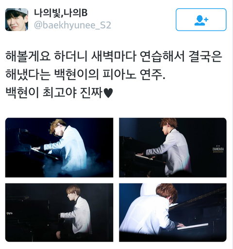 마이엔서- 보컬로서의 느낌,무빙스테이지(구름위에사 노래하는 모습강조), 백현이한테 피아노 강요햇다곸ㅋㅋㅋ첨엔 못한다했다가 10일동안 새벽같이 매일 피아노 연습한 백현이ㅠㅠㅠㅠㅠㅠ(트윗펌)