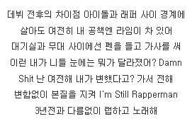 난 코닉인데 데뷔전 곡인 Climax랑 long time no see특히 비아이랩가사너무좋고 Climax처음엔 바비랩가사에 울컥하고 진환이 목소리에 착잡해지고 비아이랩가사에 오열하고 애들목소리에 더 오열함 long time no see는 무너진꿈을 다시일으키기까지가 힘들었어 이 부분 너무 슬퍼ㅠㅠ