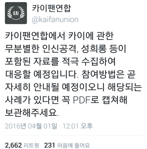 이거 공지좀 보내줘 카이팬엽합 트윗