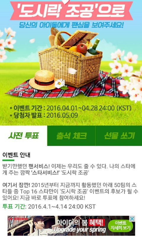 http://m.mwave.interest.me/mobileweb/promotion/starservice이삐들 어제부터 시작한투표인데 14일까지래!!우래기들은 쩌밑에ㅠㅠ 하루에한표씩꼭투표해쥬! 어떤 이삐가 올린거 그대로 가져왔어 꼭 해줘!