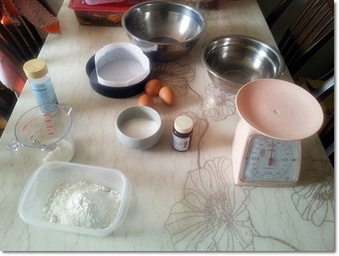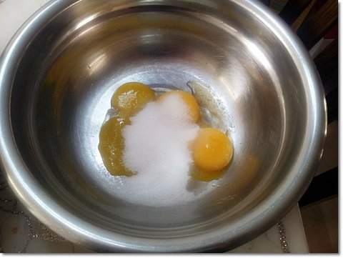 가루들의 정체는 플라스틱에는 밀가루(박력분), 유리그릇에 든 거는 설탕유리그릇 오른편에 갈색병은 바닐라 추출물왼쪽 계량컵에는 버터랑 우유가 들어 있습니다.계량컵 위에는 소금통입니다.계란 노른자와 흰자를 분리하고 노른자에는 설탕 절반정도 넣고 소금 한 꼬집정도 넣습니다.그리고 계란 비린내를 제거해주는 겸 맛을 살리기 위해 바닐라 추출물을 약간 넣습니다.