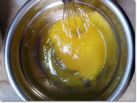 다음에는 노른자 쪽을 잘 섞어준다음에 저렇게 아이보리 색이 날 때까지 휘핑해줍니다.