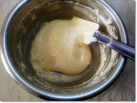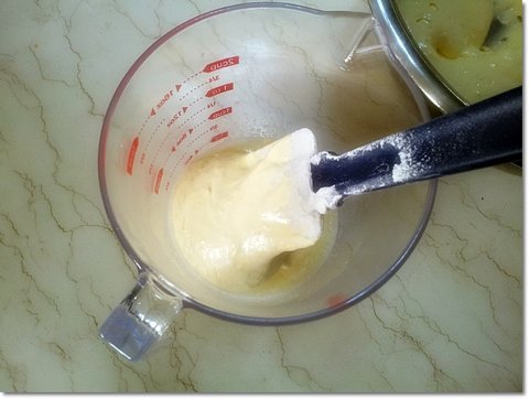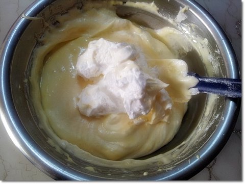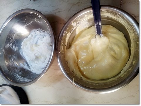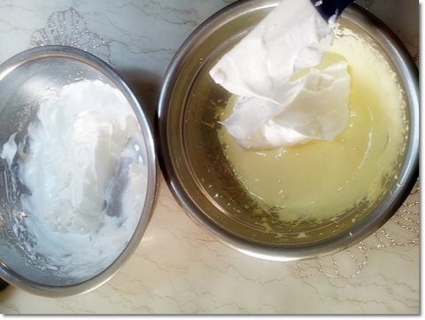 계란 흰자반죽(머랭)의 절반정도 덜어서 노른자 반죽과 섞어줍니다.