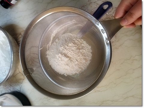 섞은 반죽에 밀가루를 채쳐서 넣은다음 잘 섞어줍니다.