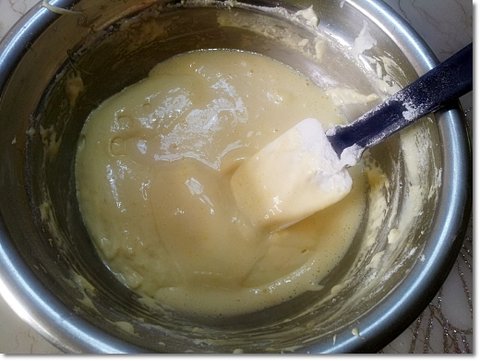 바로 섞어버리면 거품이 확 꺼질수도 있어서 반죽을 살짝 덜어서버터용액에 넣고 잘 풀어준 다음에 반죽에 섞어 줍니다.