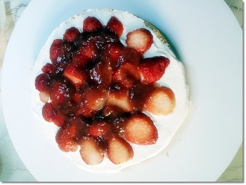 썰어둔 딸기 중에 모양이 불균일하고 안이쁜 것들 위주로 내부에 넣어줍니다.(데코용을 안에 넣으면 아깝잖아요. ㅎㅎ)그리고 위에 딸기랑 라즈베리로 직접만든 수제잼을 골고루 발라줍니다.