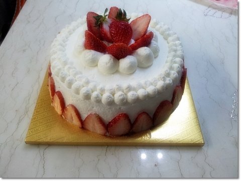 그 다음 위에 딸기로 장식해줍니다.이 작업까지 끝나면 이제 포장 받침대에다가 케익을 옮겨 놓습니다.