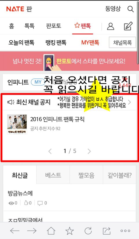 인피니트 팬톡 처음 들어오면 사진처럼 뜨는거 있었으면 좋겠다. 공지 안 읽으면 글도 못쓰고 막 그런거 있었으면 좋겠다