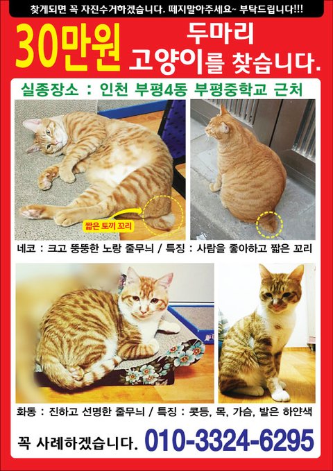 2015년 6월 입양자가 이사를 가면서 두마리 고양이 네코와 화동이를 버렸습니다.고양이 소식을 묻는 제겐 천안 시골 외할머니댁에 잠시 맡겼다고 거짓말을 해왔습니다.2016년 2월 4일 사실을 알고 살던 동네에 전단지를 붙이며 매일 찾고 있지만...두달이 지난 지금까지 찾지 못했습니다.
