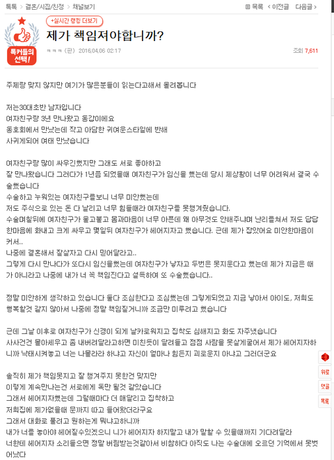잘 만나왔습니다 그러다가 1년쯤 되었을때 여자친구가 임신을 했는데 당시 제상황이 너무 어려워서 결국 수술했습니다