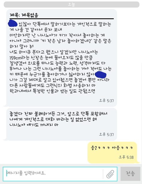 그래서 너가 키 작은 남자 좋아하냐고 물어봤더니 갑자기 이렇게 문자가 옴(어제 캡춰임)